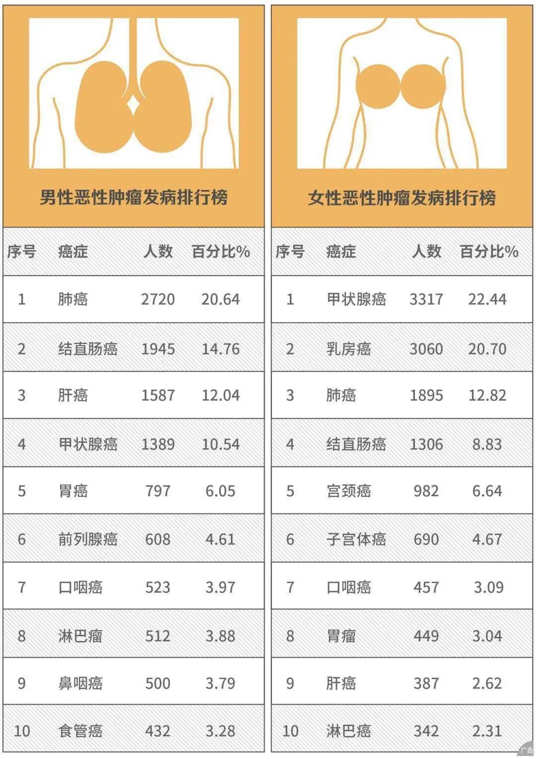 2019年,深圳市的常住人口中,共报告新发肿瘤病例27963例。按性别分类,女性中招者要多于男性——男性新发13179例,最多的是肺癌;女性新发14784例,最多的是甲状腺癌。